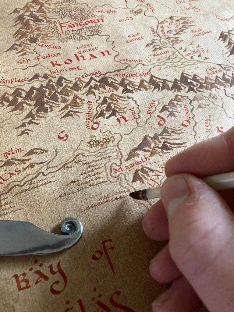Venez découvrir le travail d’Arnaud Hosse, Il reproduit des cartes, textes et dessins issus du seigneur des anneaux, le Hobbit, The Witcher… Ces reproductions sont faites avec des techniques de calligraphie et de fabrication de pigments anciennes. Il exposera dans la Salle Hermine Haute tout le week-end.